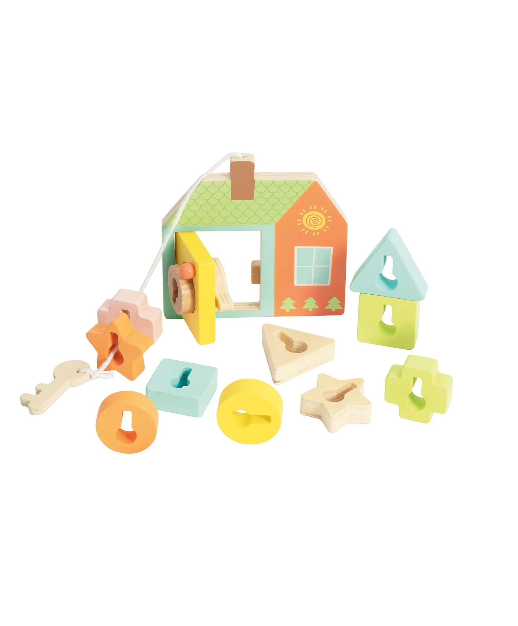 - Includes 10 lock shapes, 1 key, and a charmingly decorated door with a wooden locking mechanism.